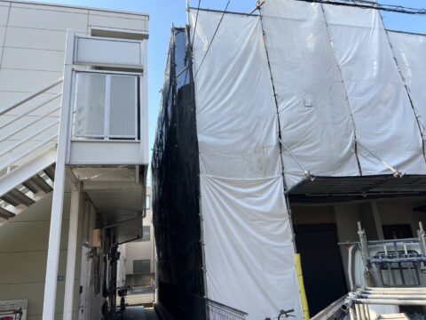 株式会社勝建設が行なった壁塗装・屋根塗装工事用足場についてご紹介いたします。