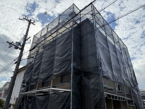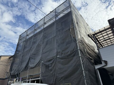 株式会社勝建設が行なった壁塗装、屋根塗装用足場についてご紹介いたします。